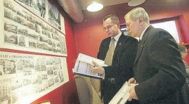 | Michał Szczerba, wiceprzewodniczacy Rady Dzielnicy Wola (od lewej) i dr Marek Tarczyński oglądają plany rewitalizacji ulicy Chłodnej Rzeczpospolita |