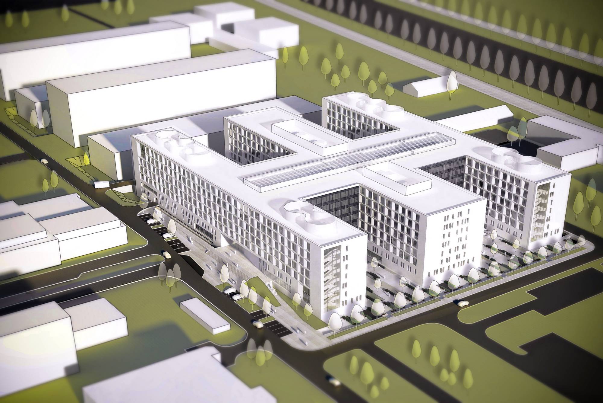 Bryłę budynku zaprojektowano w układzie mieszanym, krzyżowo-grzebieniowym, którego części połączono ośmiokondygnacyjnym holem pasażem łączącym wszystkie kondygnacje oraz krzyżujące się z nim skrzydła budynku zawierające oddziały szpitalne. Klarowny układ funkcjonalny znajduje swoje odzwierciedlenie w elewacjach, których kompozycja została podporządkowana funkcji obiektu.