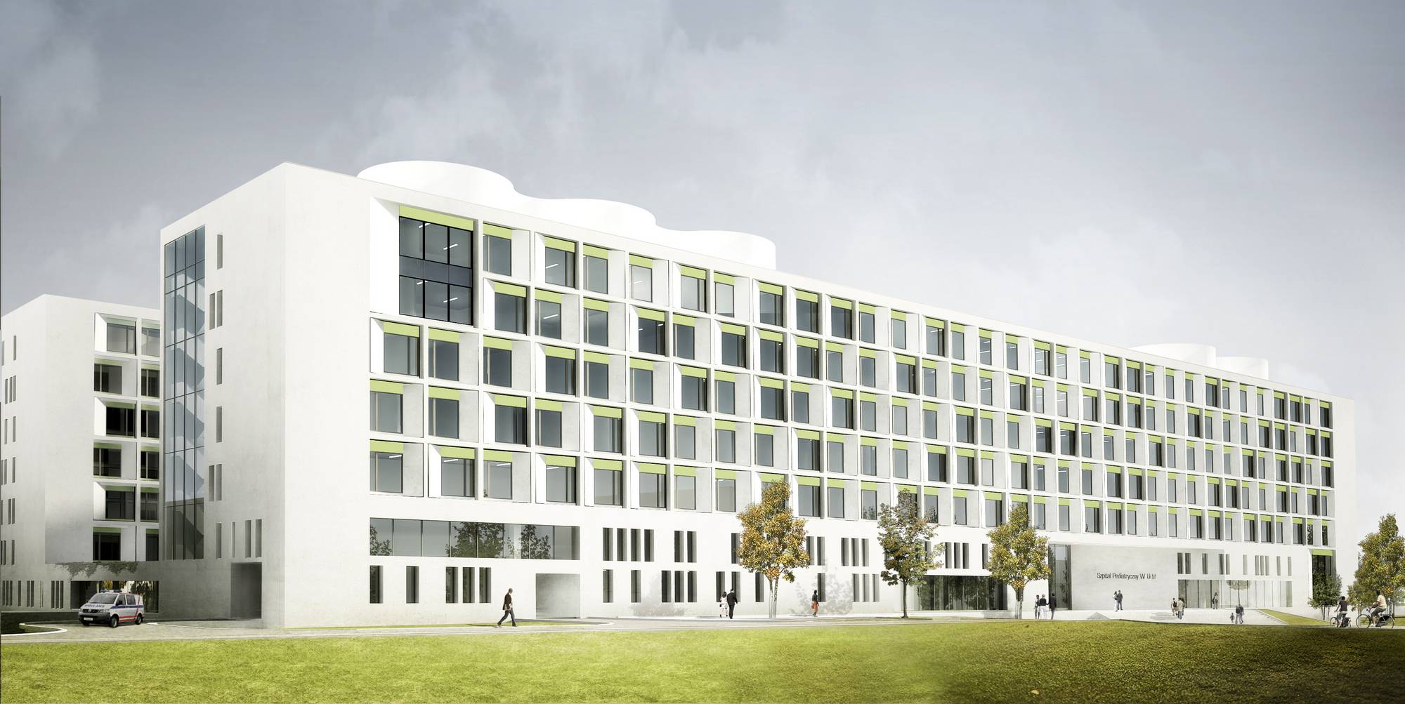 Cechą charakterystyczną budynków szpitalnych a nawet zlokalizowanego w bliskim sąsiedztwie budynku Instytutu Podstawowych Problemów Techniki PAN jest zastosowanie czarno białych materiałów elewacyjnych. Zasadniczym celem było stworzenie obiektu realizującego bogaty program użytkowy narzucony przez Inwestora, harmonijnie wpisującego się w istniejącą zabudowę i układ komunikacyjny i jednocześnie podnoszącego standard otaczającej przestrzeni, stwarzającego sprzyjające warunki użytkownikom, przyjaznego pacjentom, o czytelnym układzie przestrzennym, przy jednoczesnym optymalnym wykorzystaniu danego terenu.