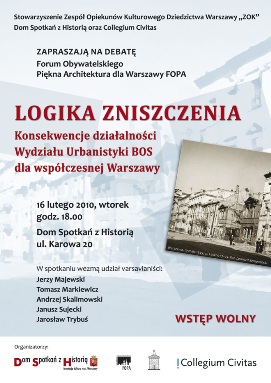 To specjalne spotkanie Forum Obywatelskiego Piękna Architektura dla Warszawy w 65. rocznicę powołania Biura Odbudowy Stolicy. rozpocznie prezentacja multimedialna. Następnie odbędzie się dyskusja z udziałem varsavianistów: Jerzego Majewskiego, Tomasza Markiewicza i Andrzeja Skalimowskiego, Janusza Sujeckiego, Jarosława Trybusia.
