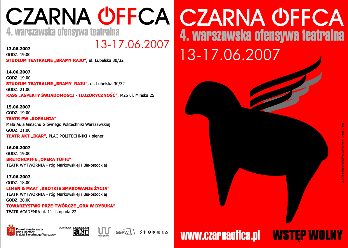 W ramach warszawskiej ofensywy teatralnej Czarna Offca pokazywane są spektakle niezależnych stowarzyszeń twórczych działających w Warszawie. Poprzez tematykę spektakli i swoją dotychczasową postawę /pracę nad sobą w ramach niewielkich grup funkcjonujących w dużym mieście/ warszawskie teatry offowe zapraszają widzów do dyskusji o roli teatru i twórczości. Zmuszają do weryfikacji i twórczego odbioru współczesnego świata i rzeczywistości.