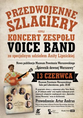Muzeum Powstania Warszawskiego zaprasza 13 czerwca o godz. 20:00 na wyjątkowy koncert zespołu Voice Band ze specjalnym udziałem Anity Lipnickiej, połączony z prezentacją najnowszej publikacji Muzeum pt. „Śpiewnik dawnej Warszawy”. Całość poprowadzi Artur Andrus. Sala pod Liberatorem, Muzeum Powstania Warszawskiego, ul. Grzybowska 79.