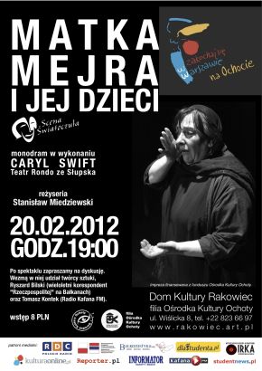 Caryl Swift w monodramie „Matka Mejra i jej dzieci” wciela się w postać tytułowej Mejry. Tekst powstał m.in. na podstawie reporterskich relacji Ryszarda Bilskiego (Urodziłam się z łopatą) i Wojciecha Tochmana (Jakbyś kamień jadła), dotyczących masakr popełnionych w imię „czystek etnicznych” podczas wojny na Bałkanach, w latach 1992-95.