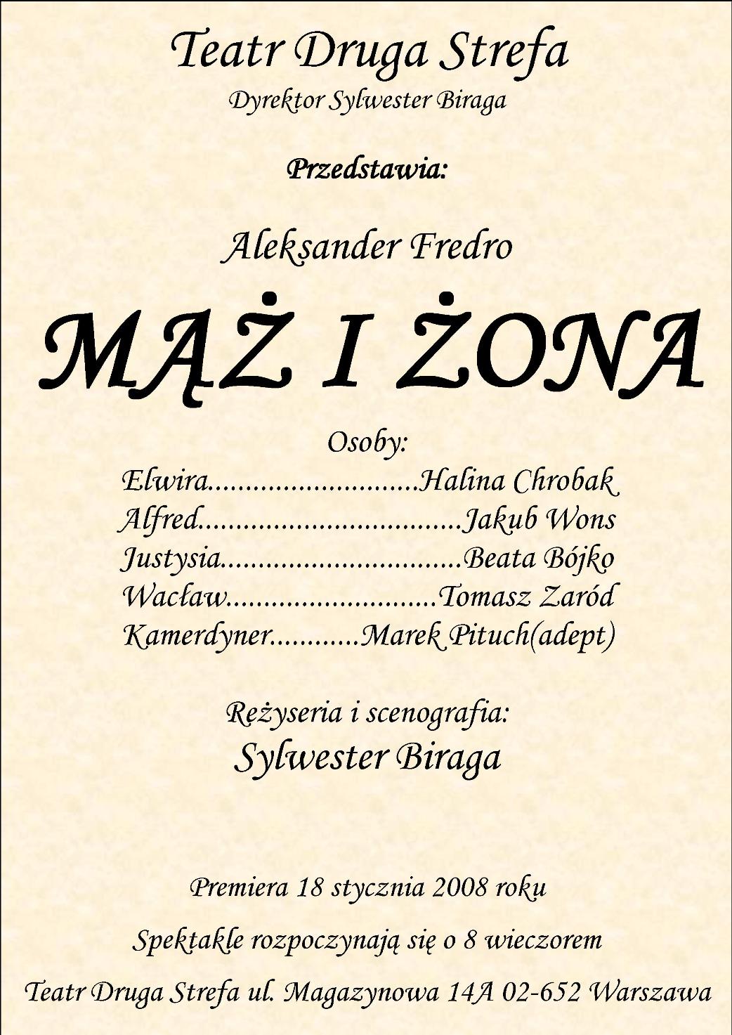 18 stycznia 2008 roku odbędzie się premiera komedii Aleksandra Fredry pod tytułem MĄŻ I ŻONA.