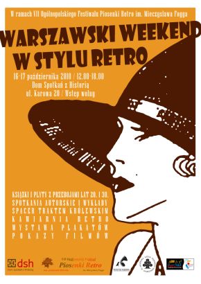 Dom Spotkań z Historią w dniach 16-17 października 2010 zaprasza na Warszawski Weekend w Stylu Retro. Przygotowaliśmy szereg wydarzeń popularyzujących okres dwudziestolecia międzywojennego. W programie: multimedialna wystawa plakatów reklamowych i filmowych, spotkania z autorami publikacji o przedwojennej Warszawie, wykłady poświęcone rewiom, kabaretom i grafice reklamowej dwudziestolecia międzywojennego, pokaz filmów z gwiazdami przedwojennego kina - Eugeniuszem Bodo i Adolfem Dymszą, spacer Traktem Królewskim. W otwartej na weekend Kawiarni Retro będzie można napić się aromatycznej kawy i posłuchać przedwojennych piosenek. Księgarnia XX wieku przygotowała specjalną ofertę wydawnictw i płyt z muzyką z lat 20. i 30.