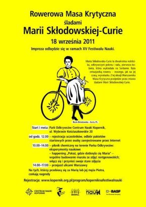 Mało znanym faktem z życia Marii Skłodowskiej-Curie jest to, że była entuzjastką nowego w swoich czasach wynalazku – roweru. Zapraszamy wszystkich chętnych do wspólnego przejazdu ulicami wraz z Warszawską Masą Krytyczną – w niedzielę 18 września . Trasę wyznaczą miejsca związane z życiem polskiej noblistki, a w każdym z nich będzie oczekiwać niespodzianka. Udział można zgłaszać na stronie: http://www.kopernik.org.pl/program/koperniknafestiwalunauki/