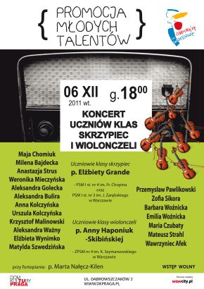 „Promocja młodych talentów” – Koncert klasy skrzypiec Elżbiety Grande (PSM I st. im. Fr. Chopina oraz PSM I st. im. J. Zarębskiego w Warszawie) oraz klasy wiolonczeli Anny Skibińskiej-Haponiuk (ZPSM nr 4 im. K. Szymanowskiego w Warszawie). Przy fortepianie – Marta Nałęcz-Kilen