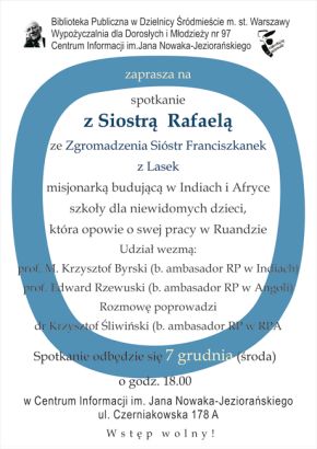 zapraszają na spotkanie z Siostrą Rafaelą ze Zgromadzenia Sióstr Franciszkanek z Lasek, misjonarką budującą w Indiach i Afryce szkoły dla niewidomych dzieci.
