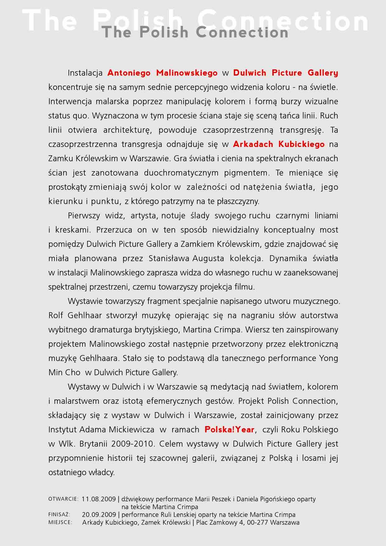 Przeszłość i przyszłość, konceptualny most pomiędzy Dulwich Picture Gallery pod Londynem a Zamkiem Królewskim w Warszawie – to pojęcia opisujące instalację Antoniego Malinowskiego The Polish Connection w Arkadach Kubickiego.