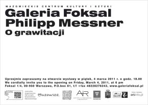 Wystawa O grawitacji w Galerii Foksal, jest pierwszą indywidualną prezentacją prac Philippa Messnera w Polsce. W ten sposób artysta odnosi się do sytuacji przebywania na rezydencji artystycznej – bycia wrzuconym w nowe miejsce, które, wraz z poznawaniem jego historii, zaczyna tworzyć specyficzne pole grawitacyjne mające bezpośrednie przełożenie na percepcję tego miejsca oraz charakter tworzonych w jego obrębie prac. Philipp Messner pracował nad koncepcją wystawy oraz produkcją prac podczas półrocznego pobytu twórczego w artists-in-residence laboratory w Centrum Sztuki Współczesnej Zamek Ujazdowski.