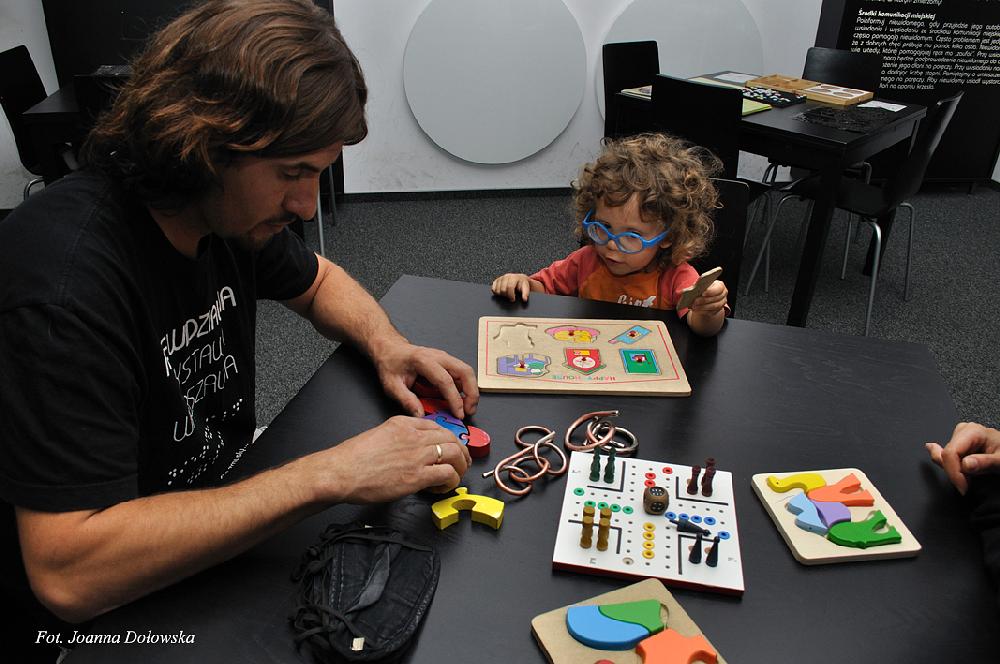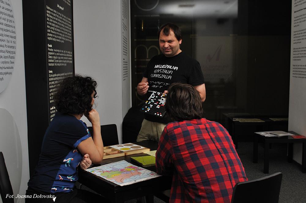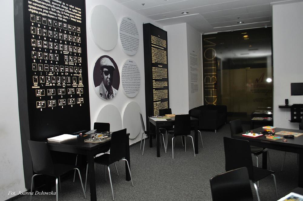 W części widzialnej wystawy można dotykać różnych rzeczy np.: pojemnik na monety; zegarek, można poznać metody nauki geografii –dzięki wypukłym mapom; można nauczyć się matematyki – dzięki kubarytmom lub napisać swoje imię na maszynie Brailla. Przy jednym ze stolików można również zmierzyć się z samym sobą - układając puzzle z zasłoniętymi oczami, z pozoru wydaje się to dziecinnie proste ale pozory mylą…