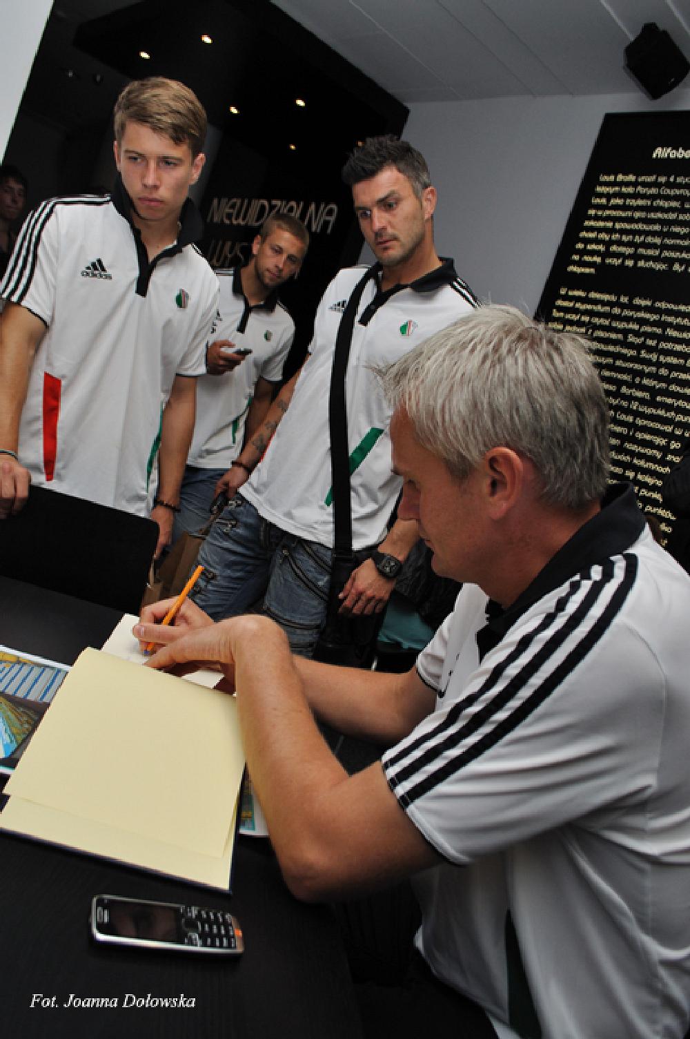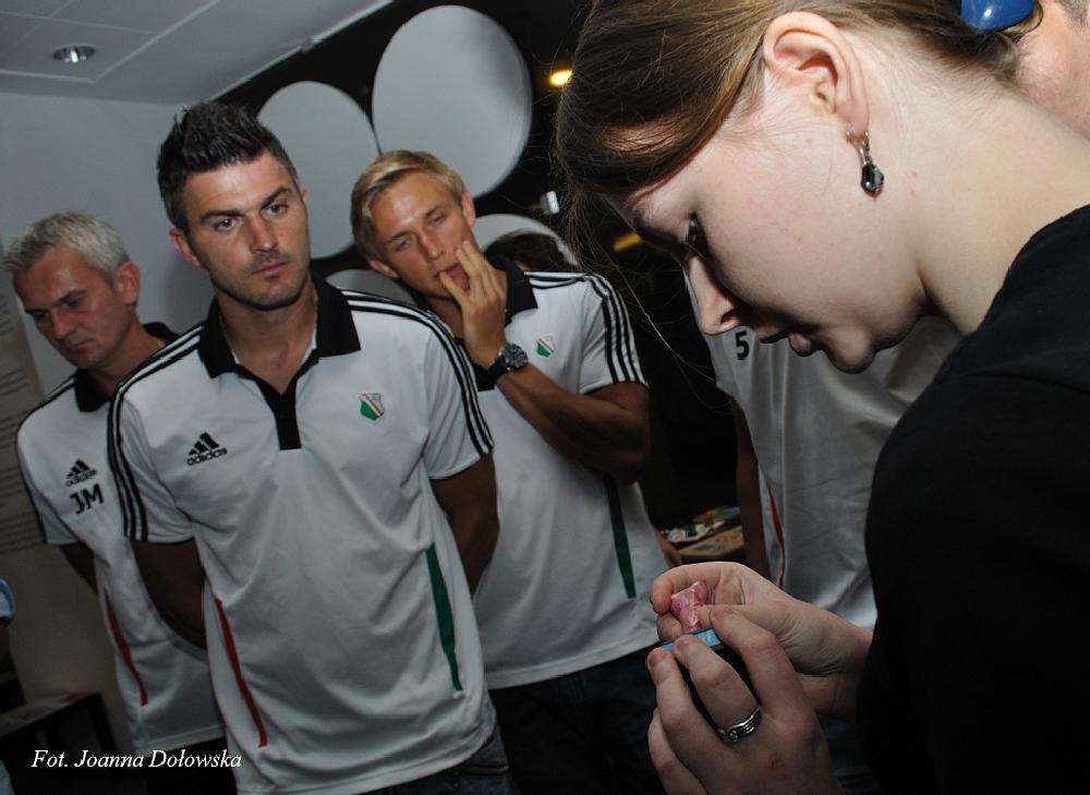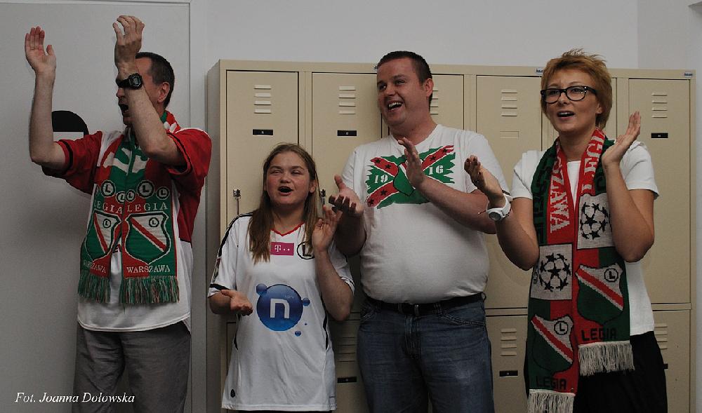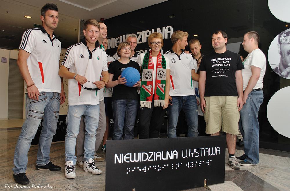 W poniedziałek 16.07.2012r miałam przyjemność uczestniczyć w spotkani kibiców Legii Warszawa z piłkarzami tegoż Klubu. Piłkarze byli lekko onieśmieleni gdy przywitano ich z pieśnią na ustach (m.in. małego Gabrysia, który wołał cicho „Miś, Miś Legia Miś…”) zaś niewidomi przewodnicy, pracujący w Niewidzialnej Wystawie, ubrani byli w koszulki i szaliki w barwach klubowych (Tomek- w koszulce Radosława Wróblewskiego sprzed wielu lat, Kasia- w koszulce Janka Gola z zeszłego sezonu, a szefowa wystawy Gosia- w szaliku Legia Champions League sprzed prawie 20lat).