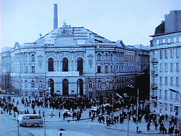 Była 4 nad ranem przed głównym gmachem było pusto (zawsze gromadziły się tam grupki ludzi), jedynie dużo milicji w dziwnych mundurach i dużo milicyjnych samochodów. Gmach był otoczony.