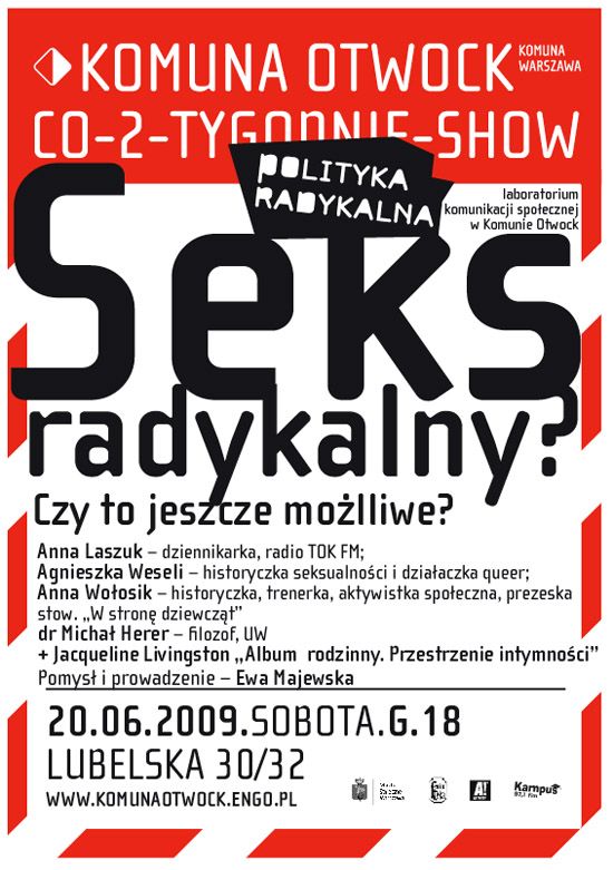 W społeczeństwie mocno zdefiniowanym ortodoksyjnym myśleniem religijnym samo słowo „seks” być może brzmi radykalnie. Obcowanie płciowe, prokreacja, poczęcie, tworzenie życia – to jest słownik, którym zwykły się posługiwać nasze elity polityczne, a nawet coraz częściej media. Z drugiej strony – kultura masowa w swoisty sposób kontynuująca specyficznie pojętą „rewolucję seksualną” obliguje nas do wyznawania określonej wersji hedonizmu – „używania” seksu tak, jak używa się gimnastyki, niemniej – w dość ściśle określony, znormalizowany sposób. Czy w seksie jest jeszcze coś oprócz świętości lub healthy sex life? Jak otrząsnąć się z ultrakonserwatywnej drzemki? Jak zarządzanie seksualnością determinuje nasze rozumienie tego tematu? Czy myślimy o nim w kategoriach zakazu, zarządzania czy może dominacji męskiej? Jak wyjść poza heteronormatywność? Te i inne pytania zadamy sobie podczas spotkania; obejrzymy również prace amerykańskiej artystki Jacqueline Livingston, której wystawa "Album rodzinny. Przestrzenie intymności" została zaprezentowana w gdańskim Pałacu Opatów.