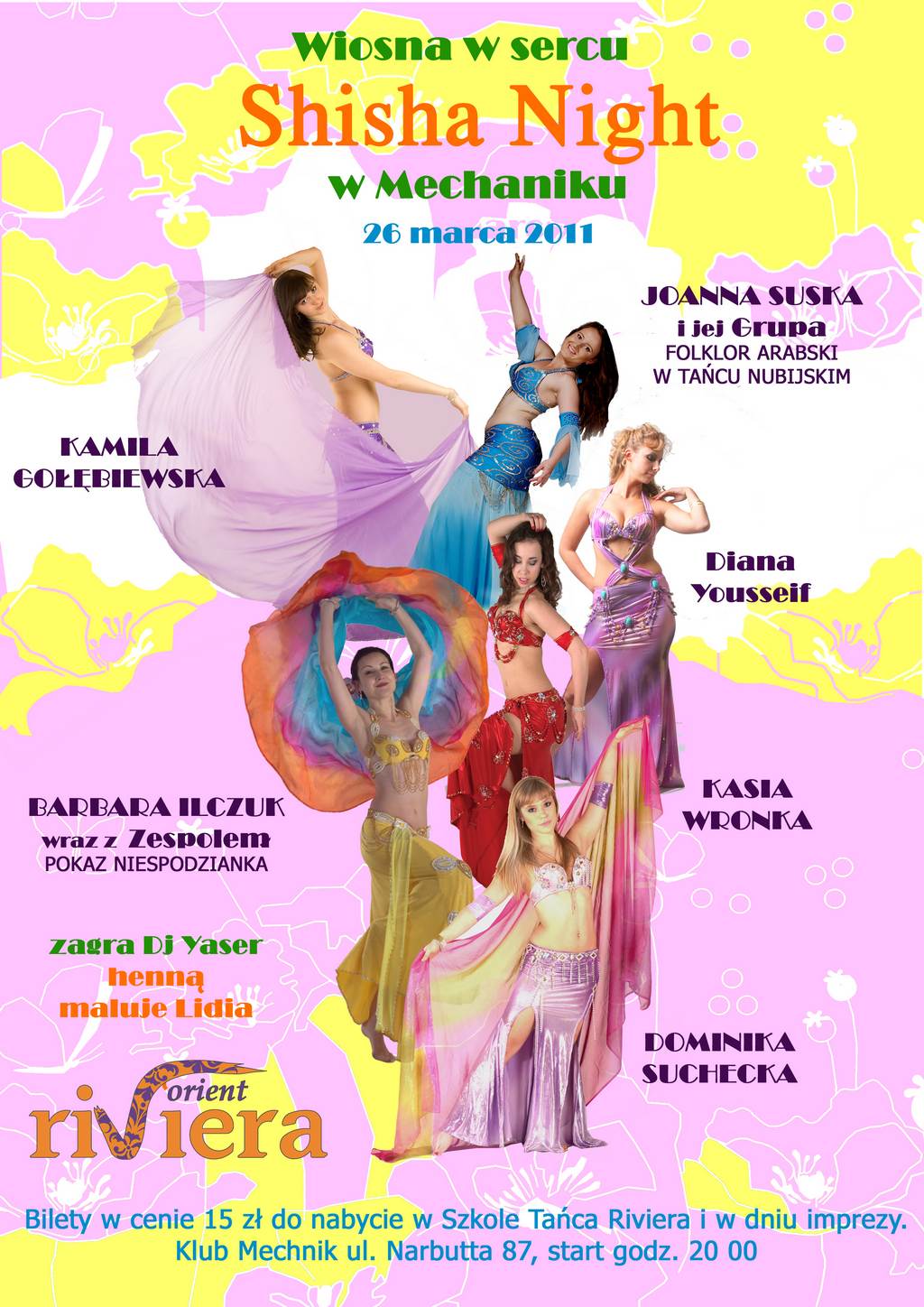 Zbliża się wiosenna Shisha Night impreza taneczna Riviery Orient podczas której wspólnie z Instruktorkami tańczymy i bawimy się na parkiecie w rytm orientalnej muzyki. Jest to jedyna w swoim rodzaju „brzuchowa” dyskoteka, na której zobaczysz swoją Instruktorkę w akcji:), zatańczysz w grupie i solo. W trakcie Shishy, bar serwuje południowe drinki, a Lidia maluje henną.
