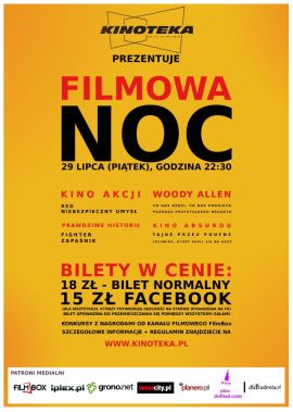 Filmowa Noc Kinoteki, to propozycja nie do odrzucenia dla wszystkich fanów dobrego kina. Na widzów czekają filmy z takich kategorii jak: Woody Allen, komedie absudru, historie prawdziwe oraz kino akcji.