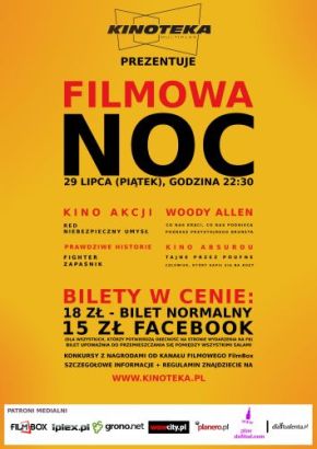 W najbliższy piątek (29 lipca) odbędzie się Noc Filmowa Kinoteki. Uczestnicy będą mieli możliwość obejrzenia hitów filmowych ostatnich. Maraton jest wyjątkowy, ponieważ fani Kinoteki na facebooku zadecydowali jakie filmy będą pokazane.