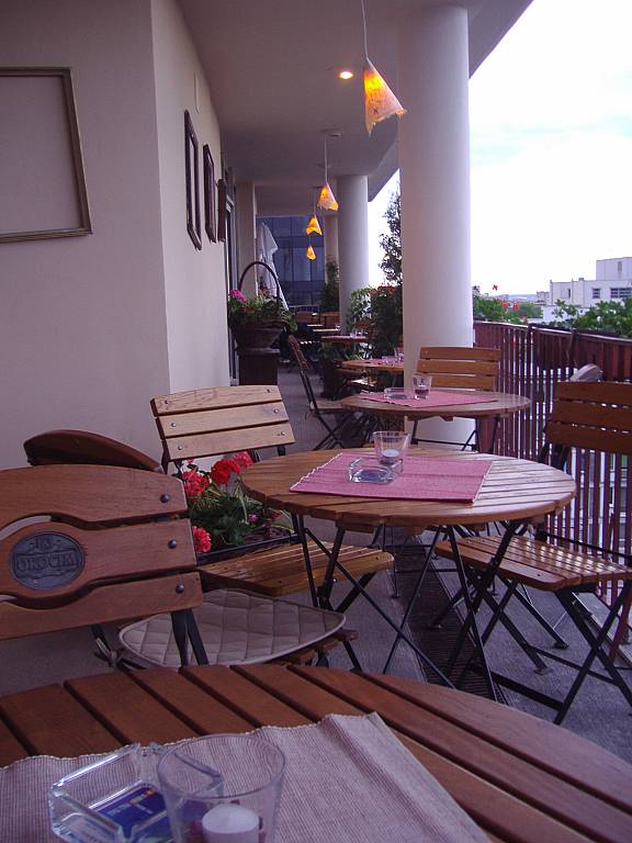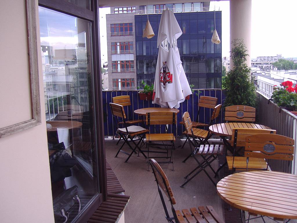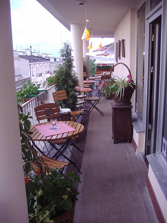 W dni cieplejsze goście mają do dyspozycji taras, z którego rozciągają się fajne widoki na trzy strony Warszawy. Często spotyka się tu osoby z aparatami fotograficznymi uwieczniającymi nasze miasto.