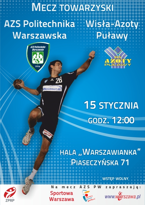 Spotkanie AZS Politechnika Warszawska - Wisła-Azoty Puławy rozegrane zostanie 15. stycznia (sobota) o godzinie 12:00. Wstęp na mecz jest wolny.