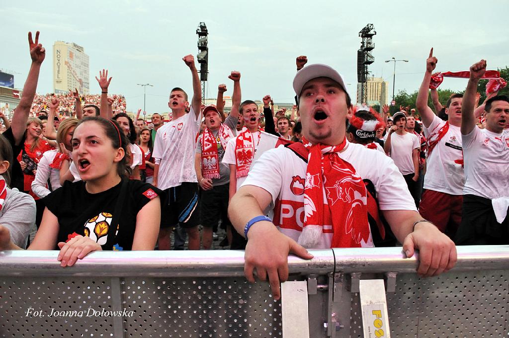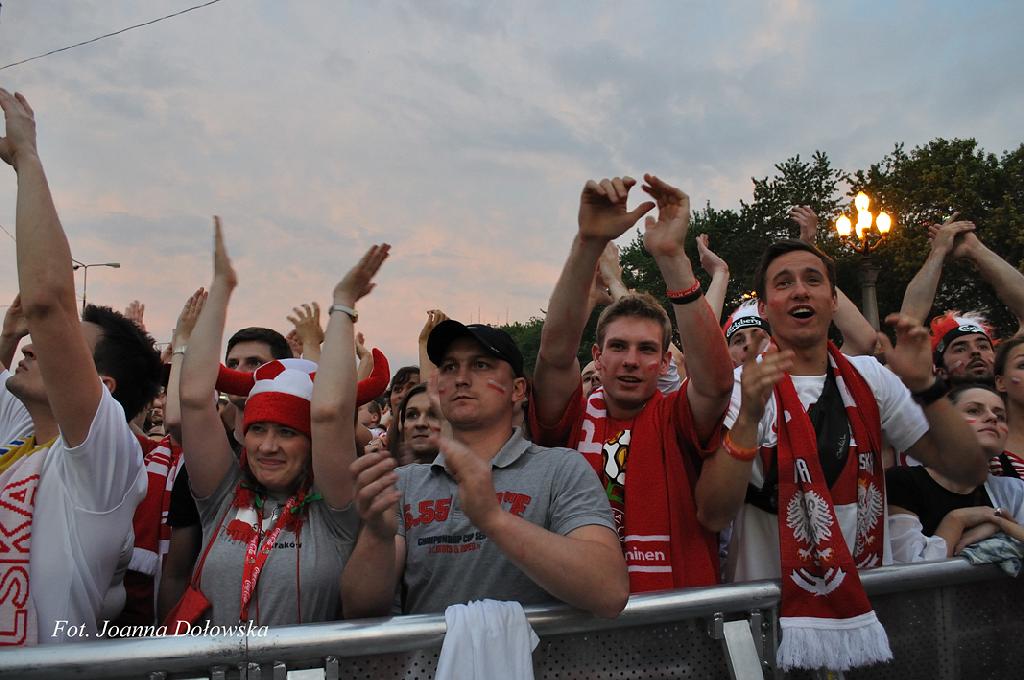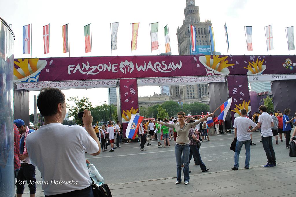 Około godziny 18:00 atmosfera na ulicy przed Strefą Kibica zaczęła się zagęszczać, słychać było wulgarne teksty cyt.: „ raz sierpem, raz młotem… itd” znane z ust młodzieżówki pewnej partii politycznej. Potem zaczęły strzelać petardy i poleciało kilka butelek, musiała interweniować policja. Na szczęście Warszawska Policja była przygotowana na takie incydenty i szybko zatrzymała awanturujące się towarzystwo. W samej Strefie Kibica nie spotkałam się z agresją i nienawiścią, tam panowała czysto karnawałowa atmosfera. Ludzie byli tak przejęci meczem, że nawet nie zauważyli kordonu policji jaki ochraniał wejścia do strefy.