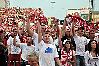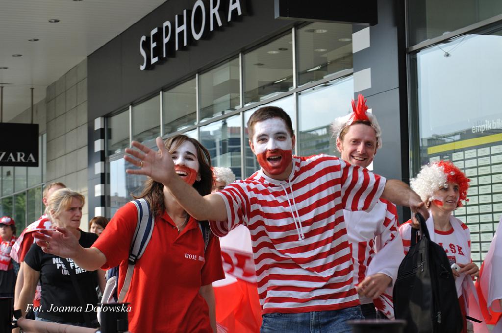 12.06.2012. prosto po pracy udałam się do centrum, by przejść się wokoło Strefy Kibica na pl. Defilad w Warszawie. Od godziny 16:00 powoli zaczęli zjeżdżać się kibice z Warszawy oraz obcokrajowcy ubrani w swoje barwy narodowe. Wzdłuż ulic Emilii Plater, Al. Jerozolimskich i Marszałkowskiej spotkałam spokojnie schodzących się na mecz kibiców min. z Hiszpanii, Rosji, Portugalii, którzy kupowali biało-czerwone gadżety (czapki, flagi itp.) i malowali sobie twarze. Prawdziwy Kibic musi mieć wymalowane policzki i dobre gardło by głośno krzyczeć dopingując swoją drużynę.