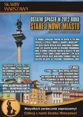 W ostatni weekend 2012 roku zapraszamy serdecznie na spacer po warszawskiej Starówce oraz Nowym Mieście. Spotykamy się w sobotę, 29 grudnia, o 13:00 na Placu Zamkowym, pod dzwonnicą kościoła św. Anny. Pogoda na plusie ma utrzymać się do Nowego Roku, dlatego liczymy na liczne przybycie Spacerowiczów! Spacery po Warszawie to doskonałe okazje do poświątecznej aktywności fizycznej!