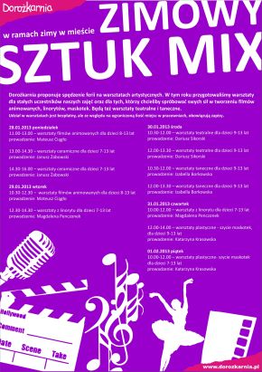 Dorożkarnia proponuje spędzenie ferii na warsztatach artystycznych. W tym roku przygotowaliśmy warsztaty dla tych, którzy chcieliby spróbować swych sił w tworzeniu filmów animowanych, linorytów, maskotek. Będą też warsztaty teatralne i taneczne.