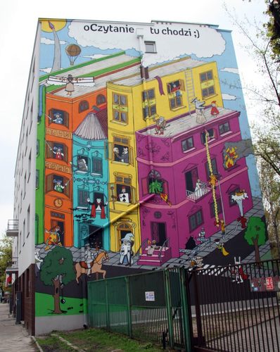 Jednak nie jest to to, do czego "przyzwyczailiśmy się" w ostatnich latach - wielki baner rozpięty na metalowej ramie. Tym razem reklama została namalowana bezpośrednio na ścianie budynku. Biorąc dodatkowo pod uwagę bajkową tematykę rysunku, mnogość szczegółów (czegóż tam nie ma!, i trzej muszkieterowie, i czerwony kapturek, i Hamlet, i Ikar) - całość należy uznać za wielce udaną ozdobę. Mimo, iż to tylko reklama.