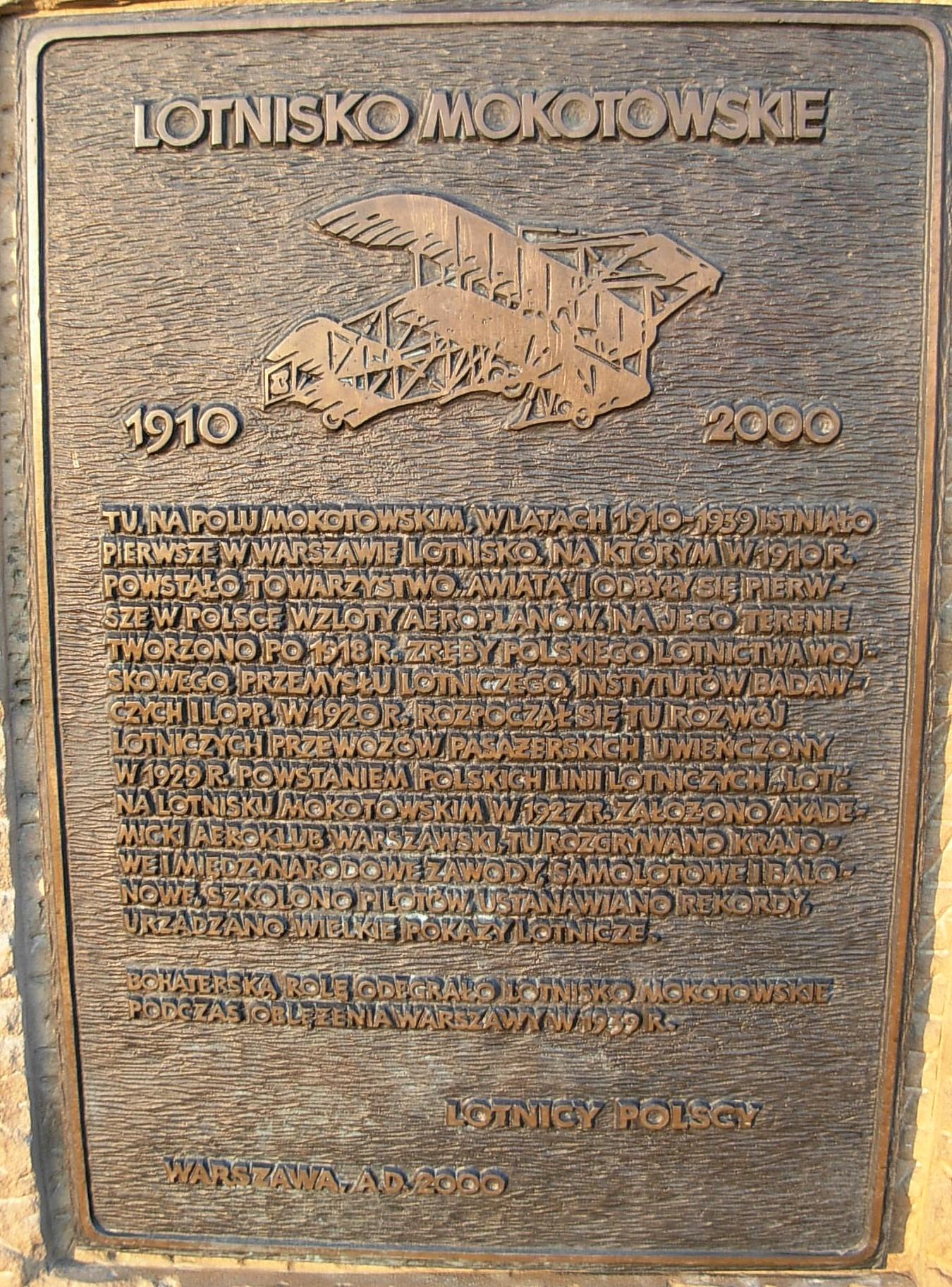 Tablica pamiątkowa Lotniska Mokotowskiego umieszczona na Polu Mokotowskim w roku 2000