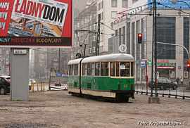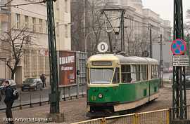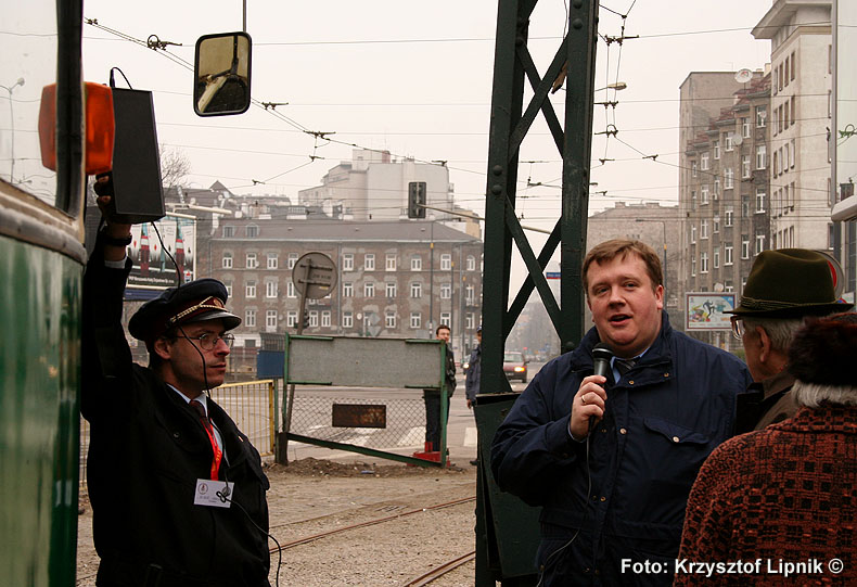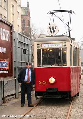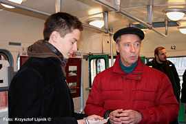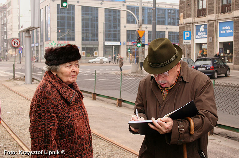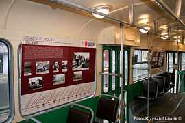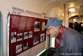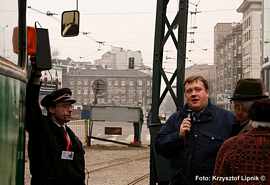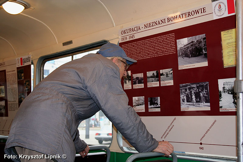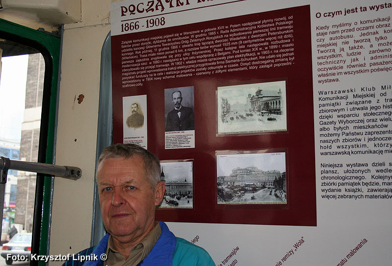 Pan Janusz Kahl (miłosnik tramwajow od 75 lat!) wnikliwie studiuje poszczególne plansze wystawy;
