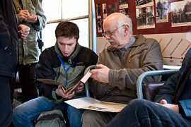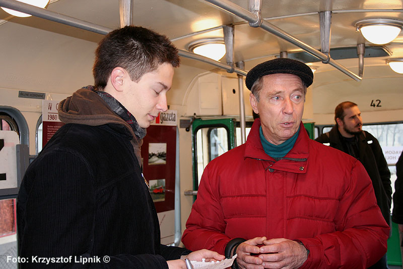 Pan Andrzej Zaorski (wraz z żoną) wpisują się do księgi pamiątkowej (wypożyczyli Klubowi Miłośników Komunikacji Miejskiej bilety służbowe z 1939 i 1942 roku);