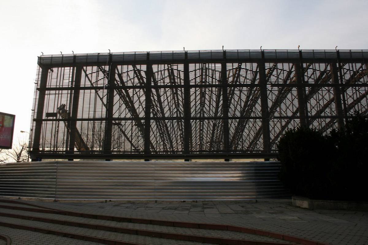 Warto przy tej okazji wspomnieć, że budynek nie miał jednolitych, zewnętrznych ścian nośnych!! "Ściany" wschodnia i zachodnia to w rzeczywistości prefabrykowane filary, na których oparte zostały stalowe łuki konstrukcyjne przykrycia dachowego. Powierzchnie między filarami wypełnione zostały taflami szkła.