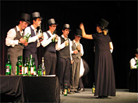 13.08.2005 o godz. 20.45 wystąpi Egri Bikaver Ensemble z Gdańska Egri Bikaver Ensemble to grupa grająca muzykę na butelkach! Ósemka młodych chłopaków bierze je w dłonie i... rozpoczyna koncert. Wówczas butelki, mniej lub bardziej napełnione wodą, przeistaczają się w instrumenty muzyczne. Oprócz chłopaków jest jedna dziewczyna – i do tego nimi wszystkimi dyryguje! Nie jest to z pewnością typowy kabaret, lecz aury, jaką roztaczają wokół siebie może im pozazdrościć niejeden satyryk. W tym roku bezdyskusyjnie wygrali najbardziej prestiżowy festiwal kabaretowy PAKA w Krakowie.
