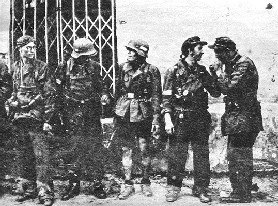 Samochód zaczął się palić. Niemcy wyskakiwali przez otwartą klapę. Dwóch trafiłem, trzeci wpadł w gruzy. «Grzymała» poszła po broń. Obserwowałem z balkonu, jak czołgała się w stronę zabitego, gdy ten nagle przewrócił się na plecy 67 i wymierzył do niej z parabellum. Byłem szybszy, po krótkiej serii Niemiec znieruchomiał. «Grzymała» wróciła nie draśnięta z bronią. Historia ta miała swe zakończenie w 1946 roku. Była niedziela, jechałem gazikiem drogą wzdłuż Łaby. Przy podjeździe na wał przeciwpowodziowy zabrakło siły w motorze, powinienem był zmienić bieg, nie zrobiłem tego i samochód stanął. Z wału przyglądał mi się żołnierz niemiecki, jak się okazało, wypuszczony z niewoli angielskiej. Podszedł, zameldował się i poprosił o jednego papierosa. Poczęstowałem go. Zauważył na moim angielskim mundurze naszywkę «Poland». Przedstawił się, że jest Austriakiem, zna Polskę, walczył w sierpniu 1944 roku w Warszawie. Zapytałem go, w jakiej dzielnicy. W Śródmieściu. Opowiedział mi, jak dwukrotnie uniknął śmierci w niewiarygodnych sytuacjach - raz wyskakując z płonącego samochodu pancernego i drugi raz, kiedy kula wystrzelona z bliskiej odległości trafiła go w mosiężną klamrę od paska. I pokazał mi ślad kuli na klamrze. Powiedziałem mu, że to ja do niego strzelałem. Popatrzył na mnie, zgasił papierosa i dodał na pożegnanie: «Przeleżałem w gruzach trzy doby, trzeciej nocy doczołgałem się do Ogrodu Saskiego»".
